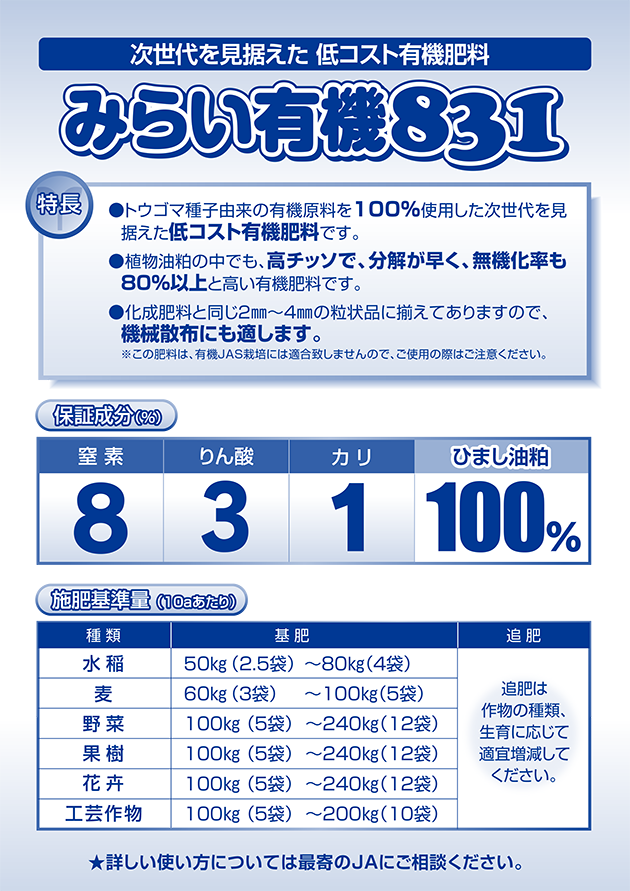 ・ひまし油粕は植物油粕のなかでも高窒素で、分解が早く、無機化率も80%以上と高い有機原料です。