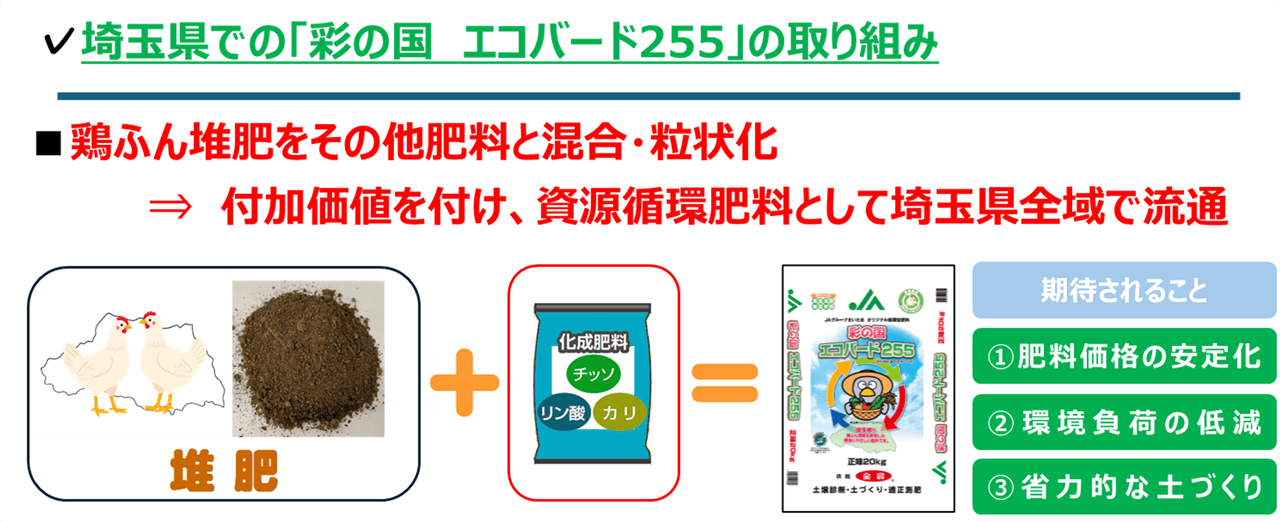 当社が埼玉県の関係機関との連携のもと、埼玉県内の畜産農家で発生した鶏ふん堆肥を約45%使用した混合堆肥複合肥料「彩の国 エコバード255」を開発、生産者が使いやすい形状で、他の肥料と比較して価格変動幅の抑制を実現しました。